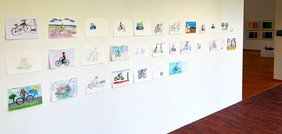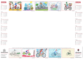 Schreibtischunterlage mit Kalender für das Jahr 2026. Im Zentrum stehen für dieses Jahr Fahrradfahrer*innen. Künstler*innen und Partient*innen haben für die Unterlage eigene Bilder eingereicht und aus diesen Werken wurden die Bilder für die Schreibtischunterlage ausgewählt.