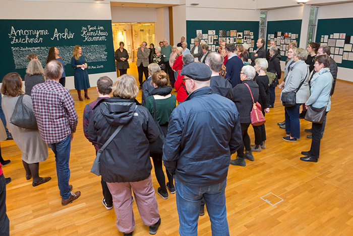 Im Kunsthaus Kannen wurden 537 Arbeiten aus dem ARCHIV DER ANONYMEN ZEICHNER ausgestellt, darunter auch Zeichnungen von Künstlern aus den Ateliers des Kunsthauses. Alle Zeichnungen waren ohne Nennung von Namen und Lebensläufen ausgestellt. Dadurch entstand neuer Freiraum für ein unbefangenes Betrachten und auch Beurteilen Kunst. Die Arbeiten aller beteiligten Künstler*innen ergaben auf den Ausstellungswänden eine Gesamtinstallation ohne Hierarchien. Aufgebaut wurde die Ausstellung von Anke Becker, sowie Inken Reinert und Veronike Hinsberg.