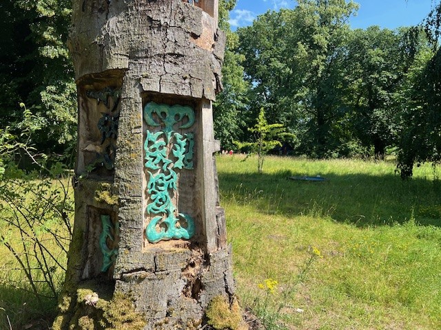 Die Keramikarbeiten in Galeriebaum vor dem Kunsthaus wurden von dem Künstler des Kunsthauses Stefan Reimer und dem Kunststudenten Finn Köhntop geschaffen. Die zwei Muster der Künstler wachsen in der gemeinsamen Arbeit zusammen. Stefan Reimers Muster wurden bereits in einigen Ausstellungen im Kunsthaus Kannen präsentiert. Auch Finn Köhntop beschäftigt sich in seinem Studium an der Kunstakademie Münster ebenfalls mit Mustern. Bereits für die Wellenlänge, eine Ausstellung, in der Kunststudierende gemeinsam mit Künstler:innen des Kunsthaus Kannen an Werken arbeiten, schufen die beiden zusammen ein Kunstwerk. Im Anschluss an die Arbeit für die Ausstellung schufen die beiden gemeinsam die Werke, die jetzt in dem alten Baum vor dem Kunsthaus zu sehen sind. Welcher Künstler hat wohl welche Muster gemacht? Obwohl die Handschrift der beteiligten Künstler noch zu erkennen ist, fügen sie sich zu einem harmonischen Ganzen zusammen.